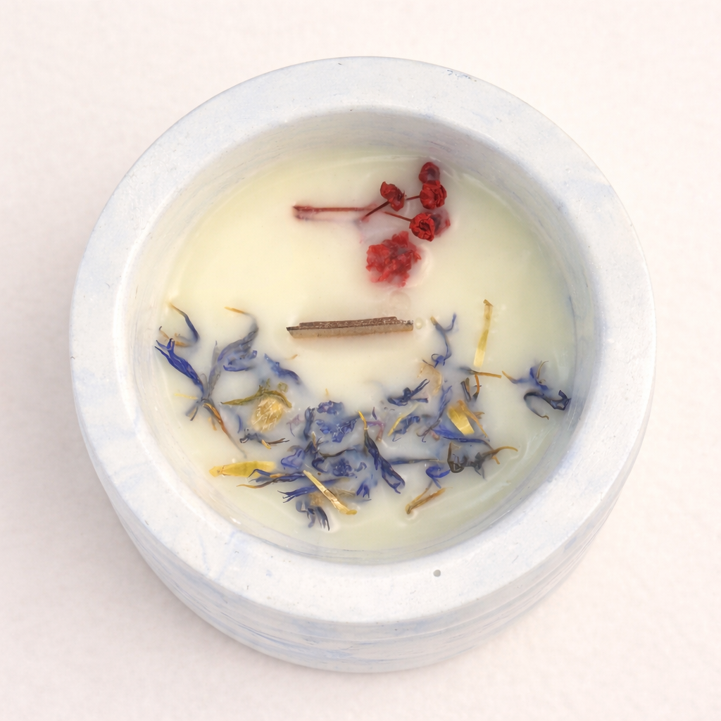 Una pieza artesanal creada para aportar luz cálida, aroma y un detalle decorativo elegante. Elaborado a mano en Jerez de los Caballeros, España con cera de soja 100% vegana, sin parafina. Portavelas/soporte artesanal de yeso hecho a mano (según diseño). Formato: 90 g. Medidas aproximadas: 8 × 8 × 9 cm.