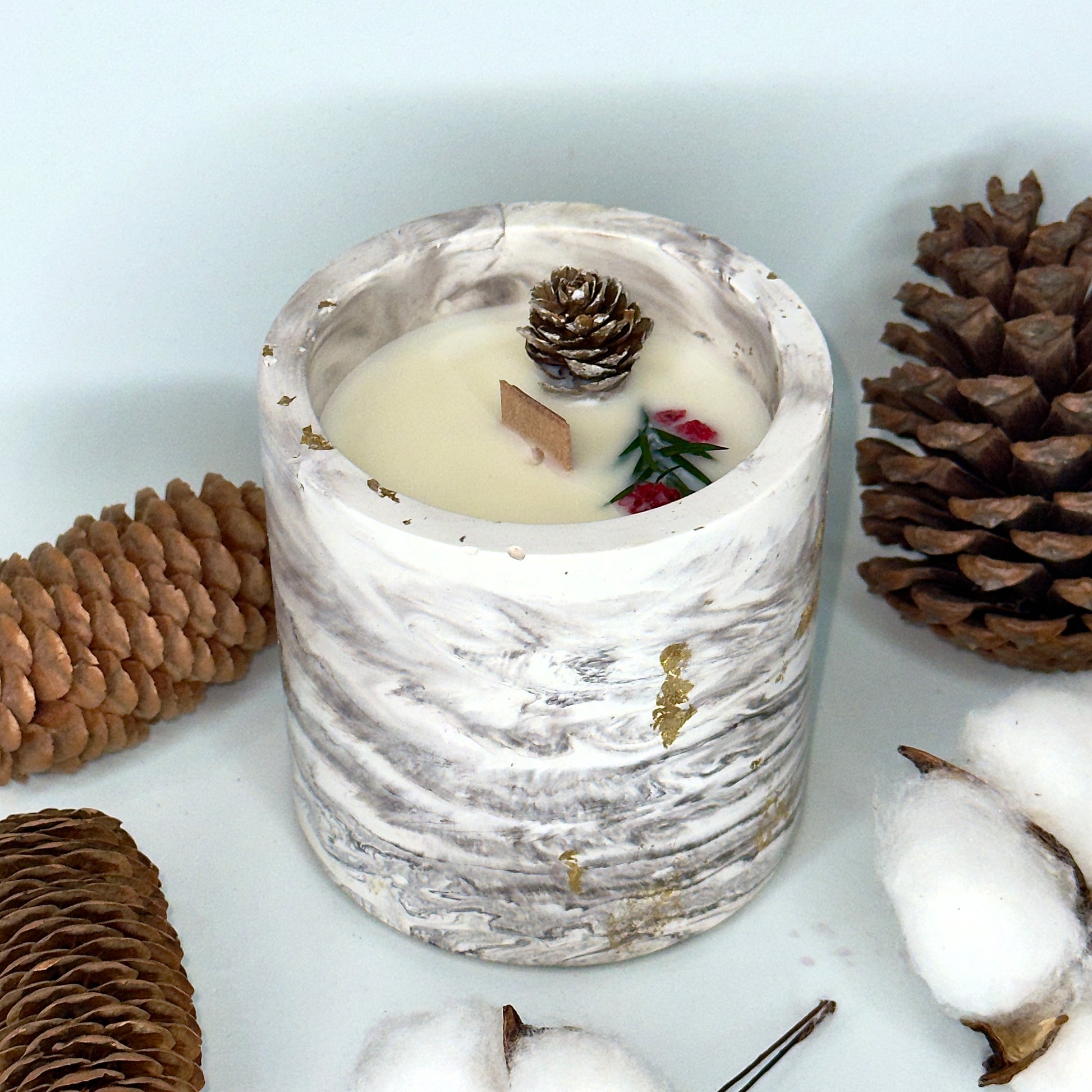 La vela Mármol Blanco-Gris Canela – 250 g es una pieza artesanal creada para llenar tu hogar de calidez navideña. Su recipiente marmoleado en tonos blancos y grises, con toques de pan de oro, aporta un estilo elegante y actual que encaja en cualquier decoración de invierno.