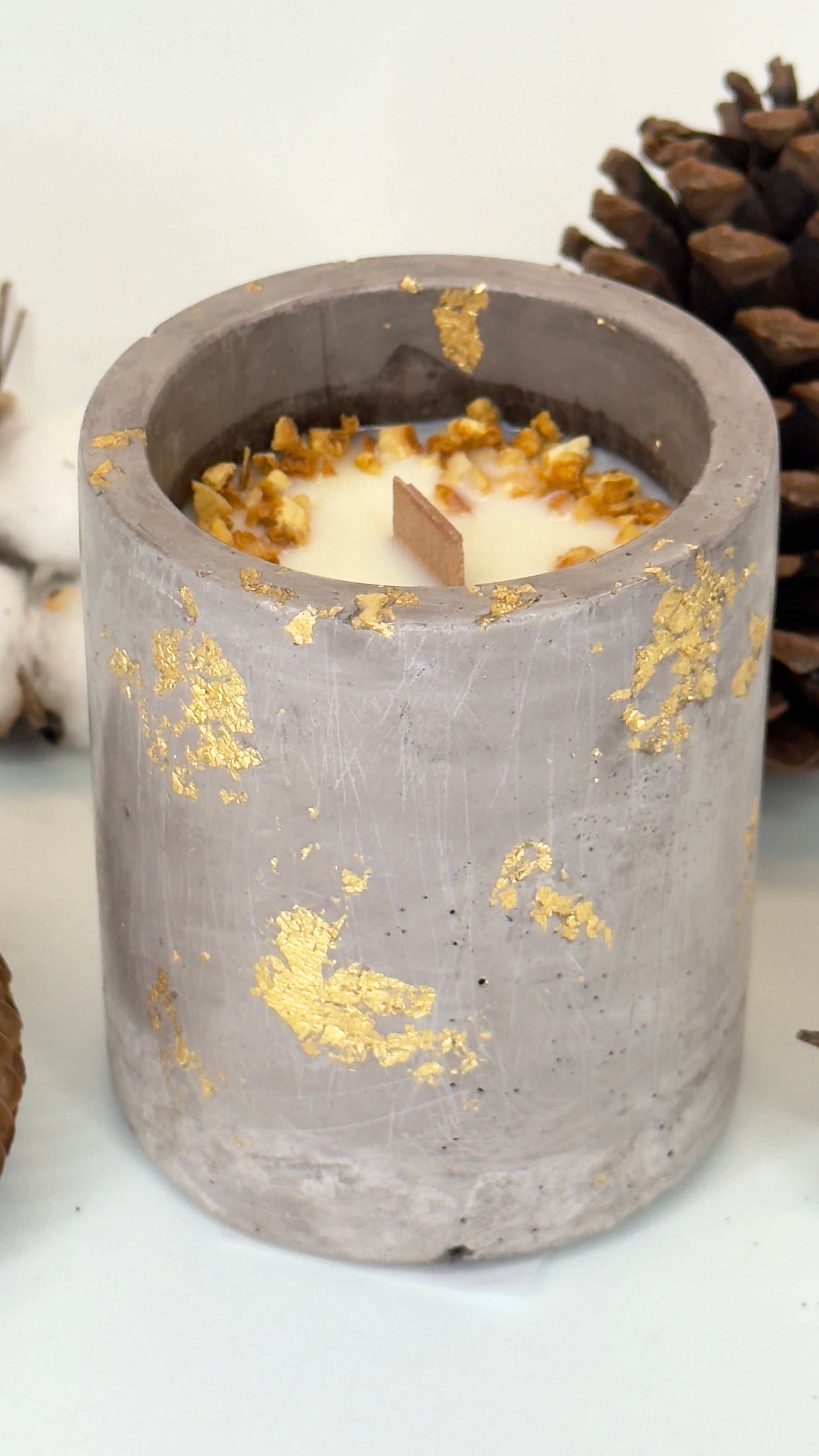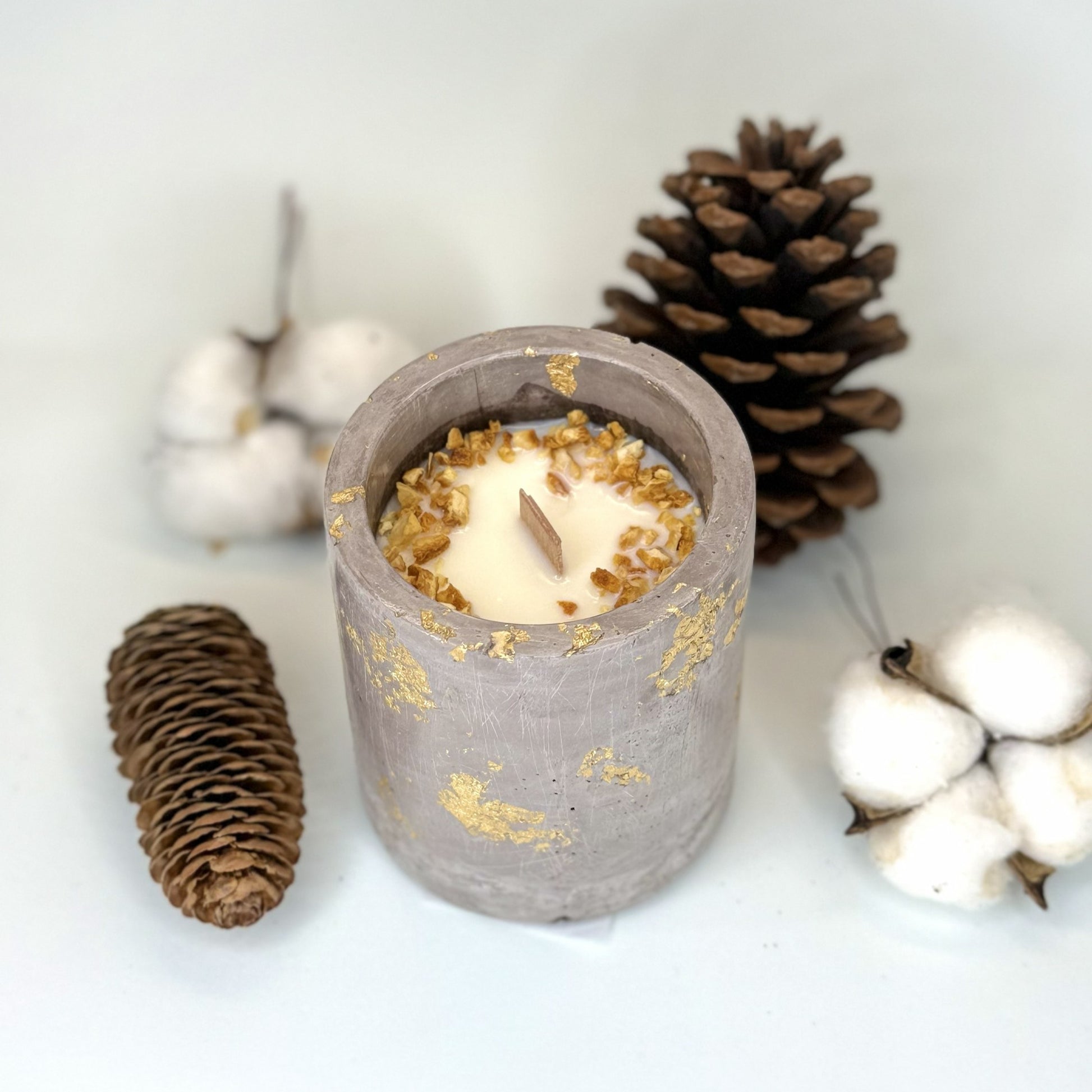 Cada pieza es única: la combinación de textura, dorado y decoración cítrica convierte esta vela en un objeto decorativo con mucha personalidad.